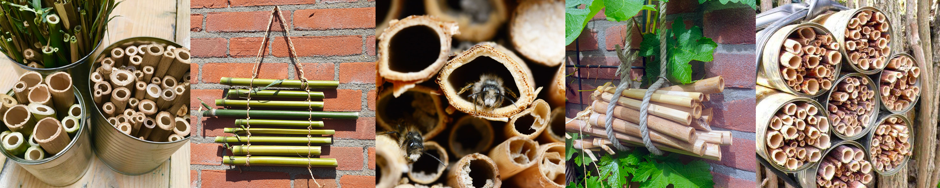 Je kunt ook een bijenhotel maken. Dat is een klein huisje met holletjes waar wilde bijen kunnen slapen en hun eitjes leggen.